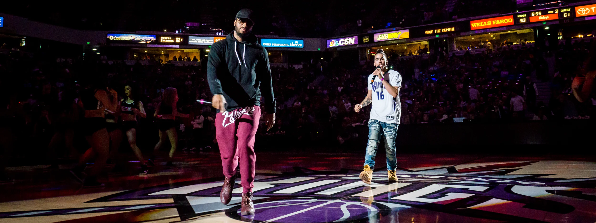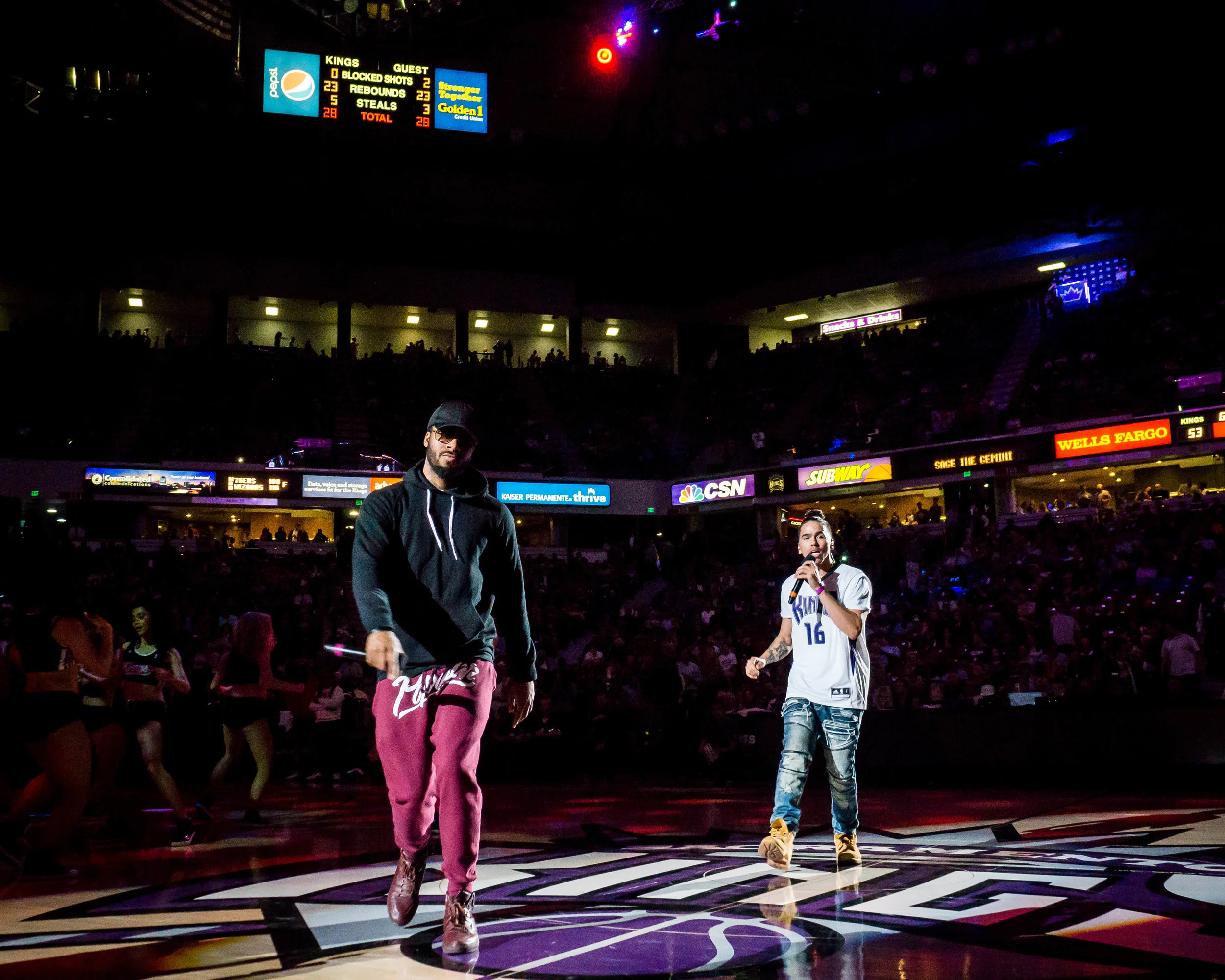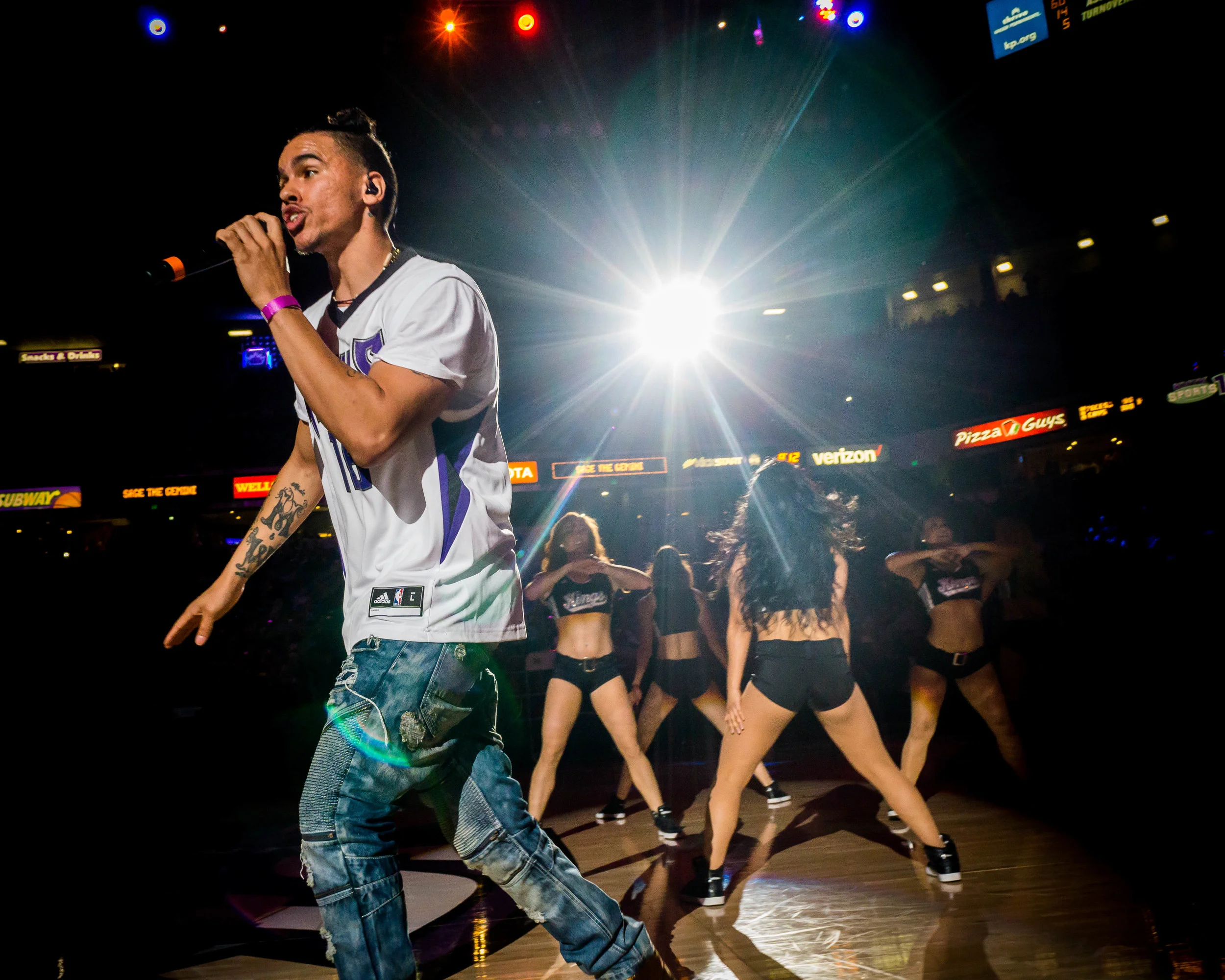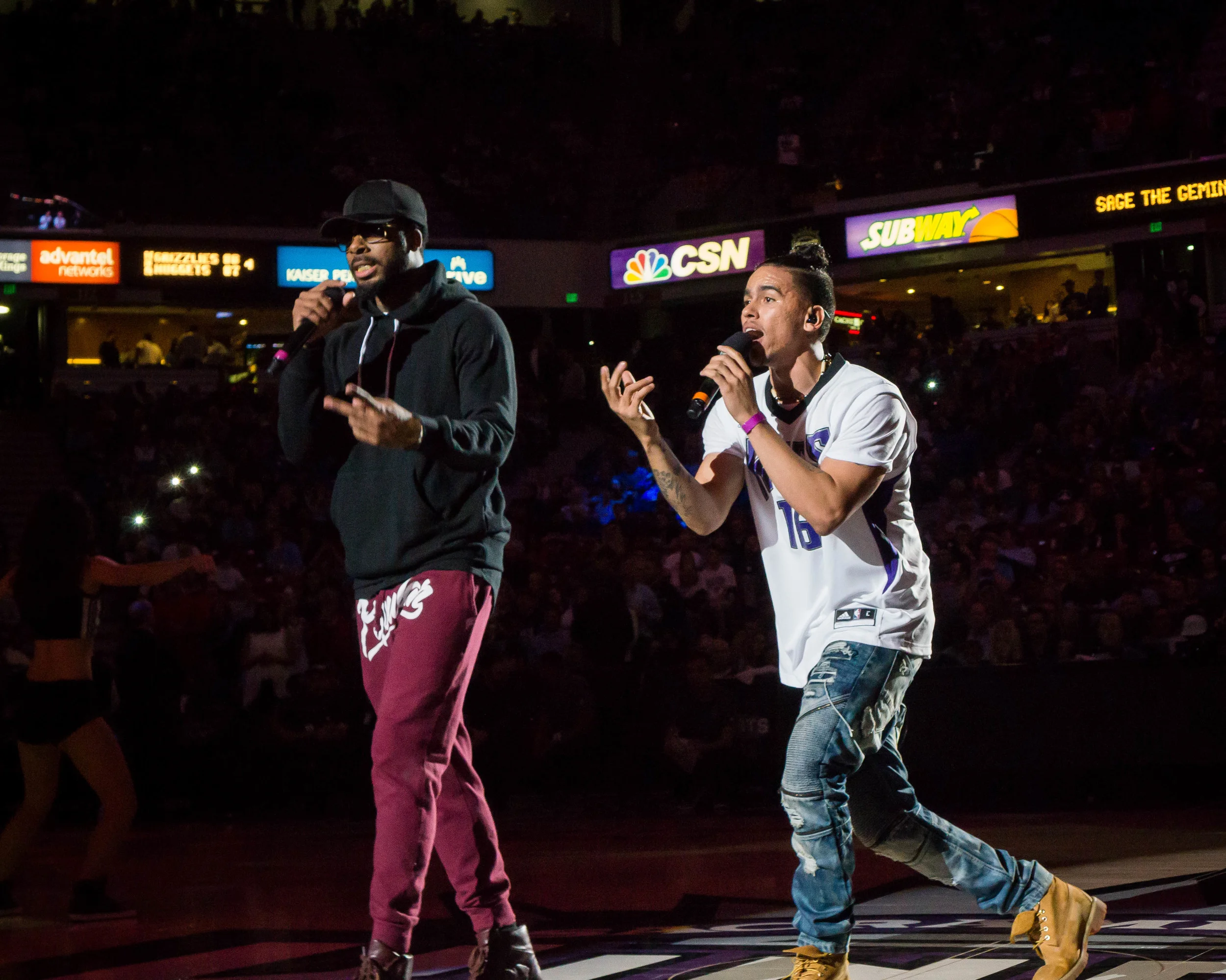 Adrian Marcel and Sage the Gemini rolled into Sleep Train arena to perform at halftime during the Kings v. Thunder game on Monday Feb. 29, 2016. They electrified the crowd as they joined the Sacramento Kings Dancers on the court. I was on the floor covering their performance. Check out my best images from that show below!