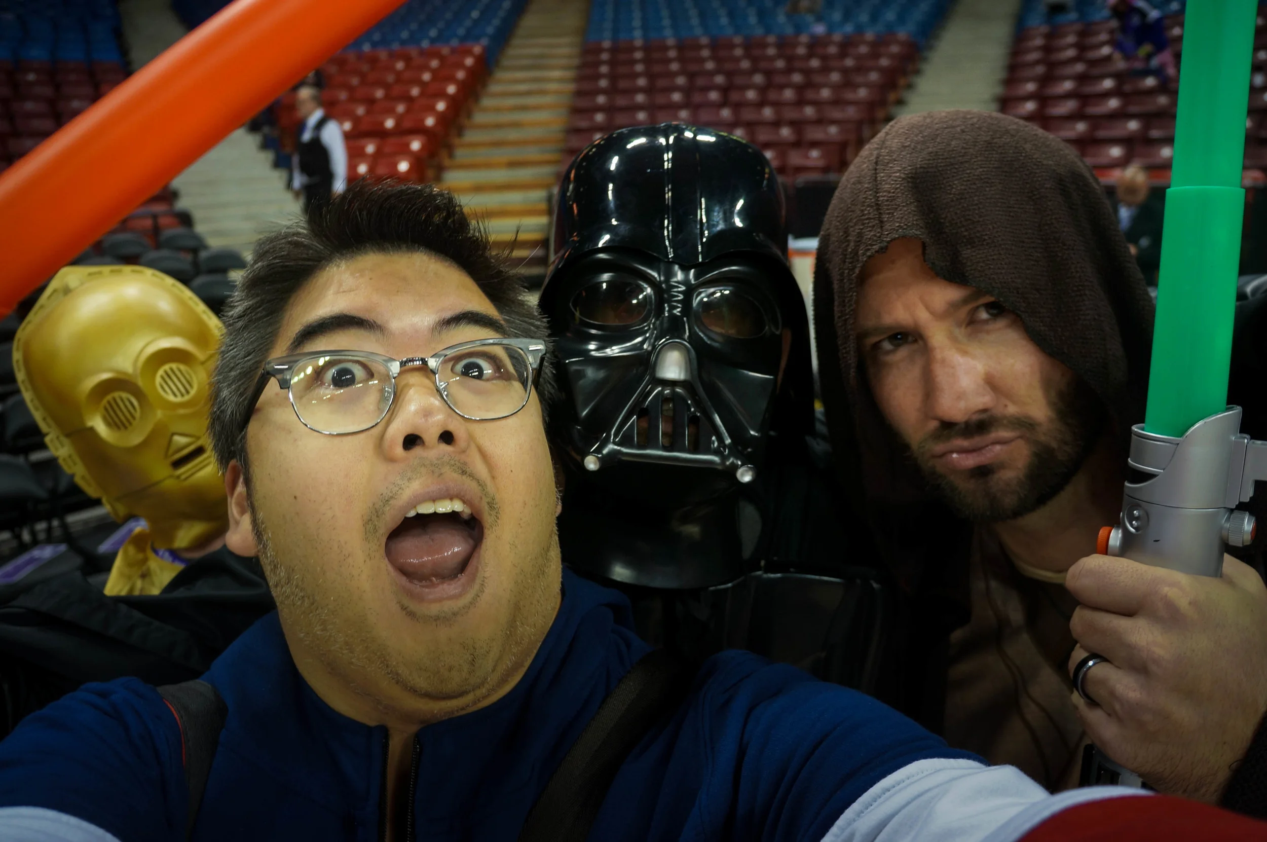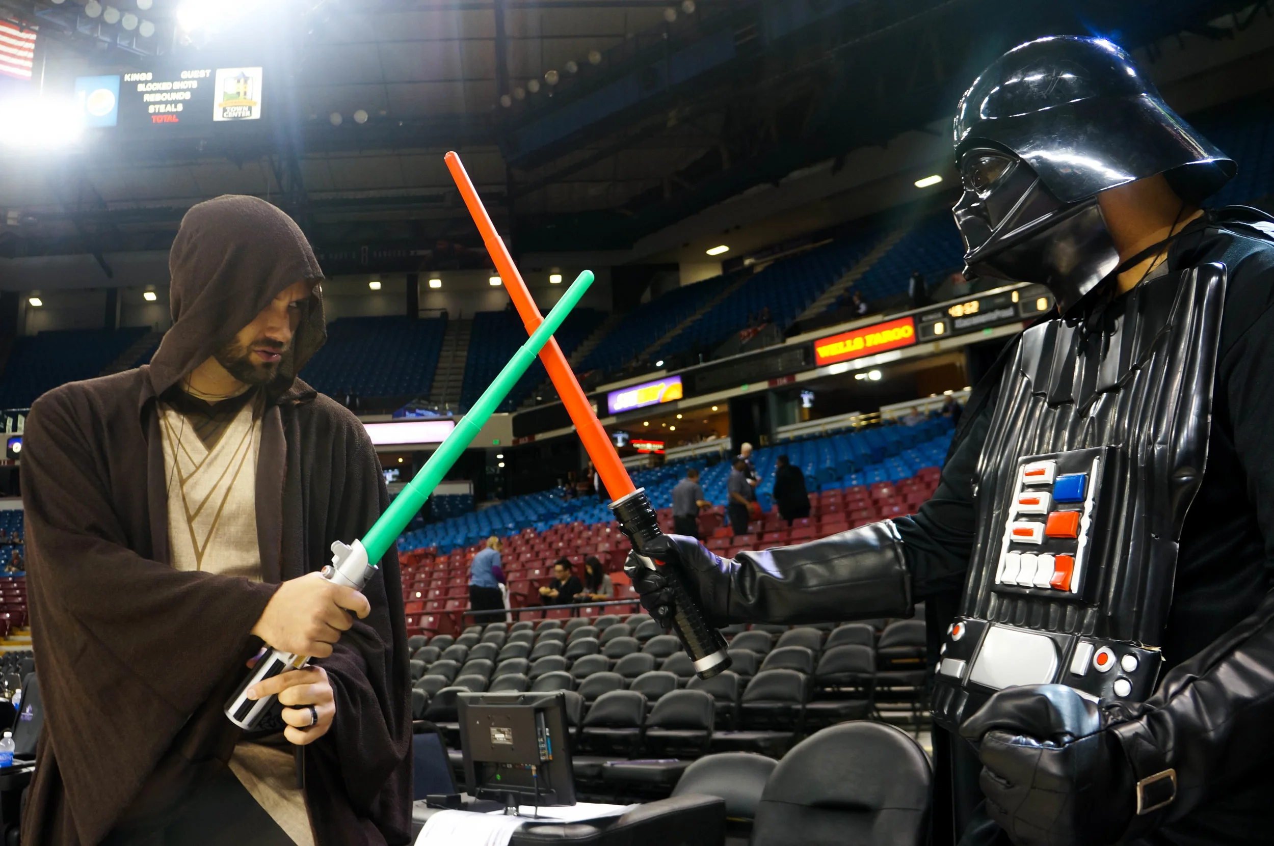 Halloween night at Sleep Train Arena was loads of fun. The fans and the Kings organization made sure that those who came out had a really entertaining experience. Above we see game host Scott Fresh and PA announcer Scott Moak sparring with their lightsabers before the game.