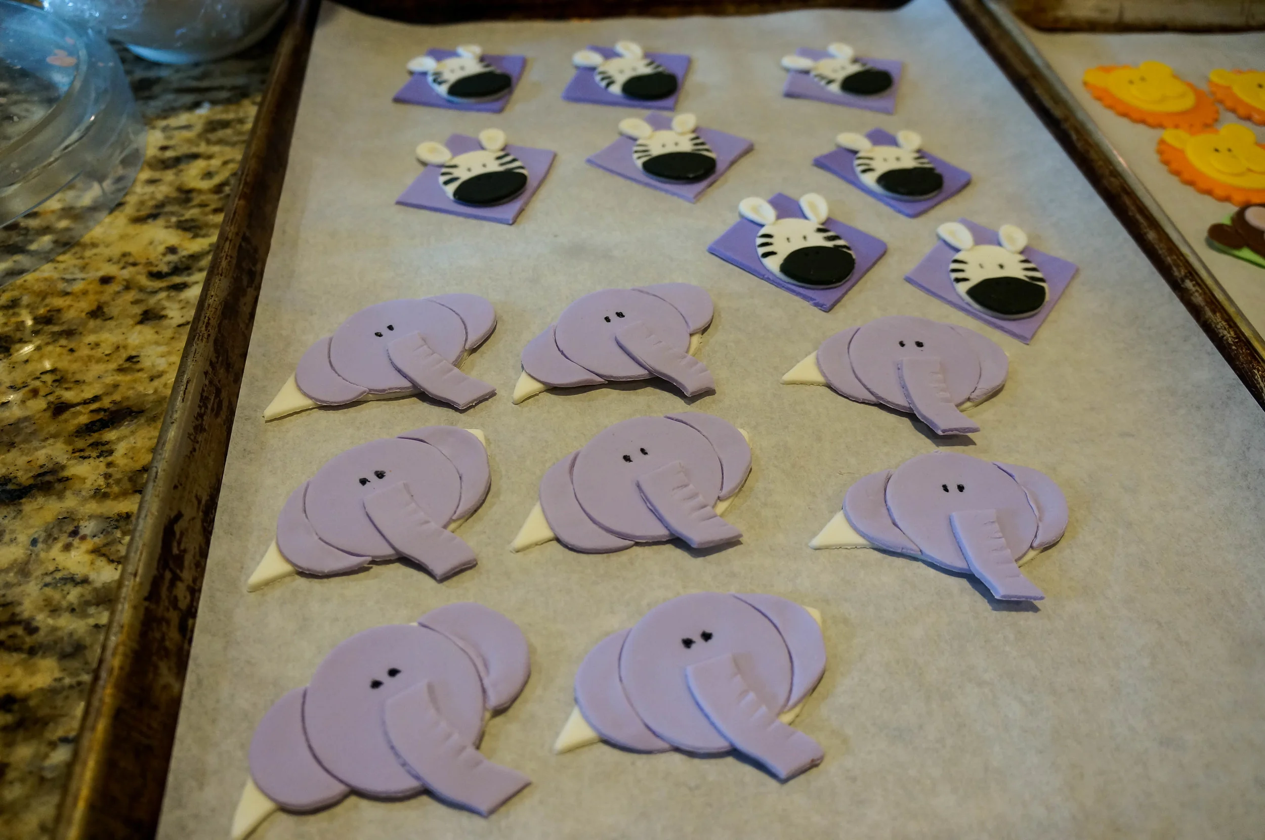 These animal decorations were so cute! Besides these elephants and zebras, there were also lions, monkeys, and giraffes. Jenn had to use a lot of different colored fondants in order to put these together.