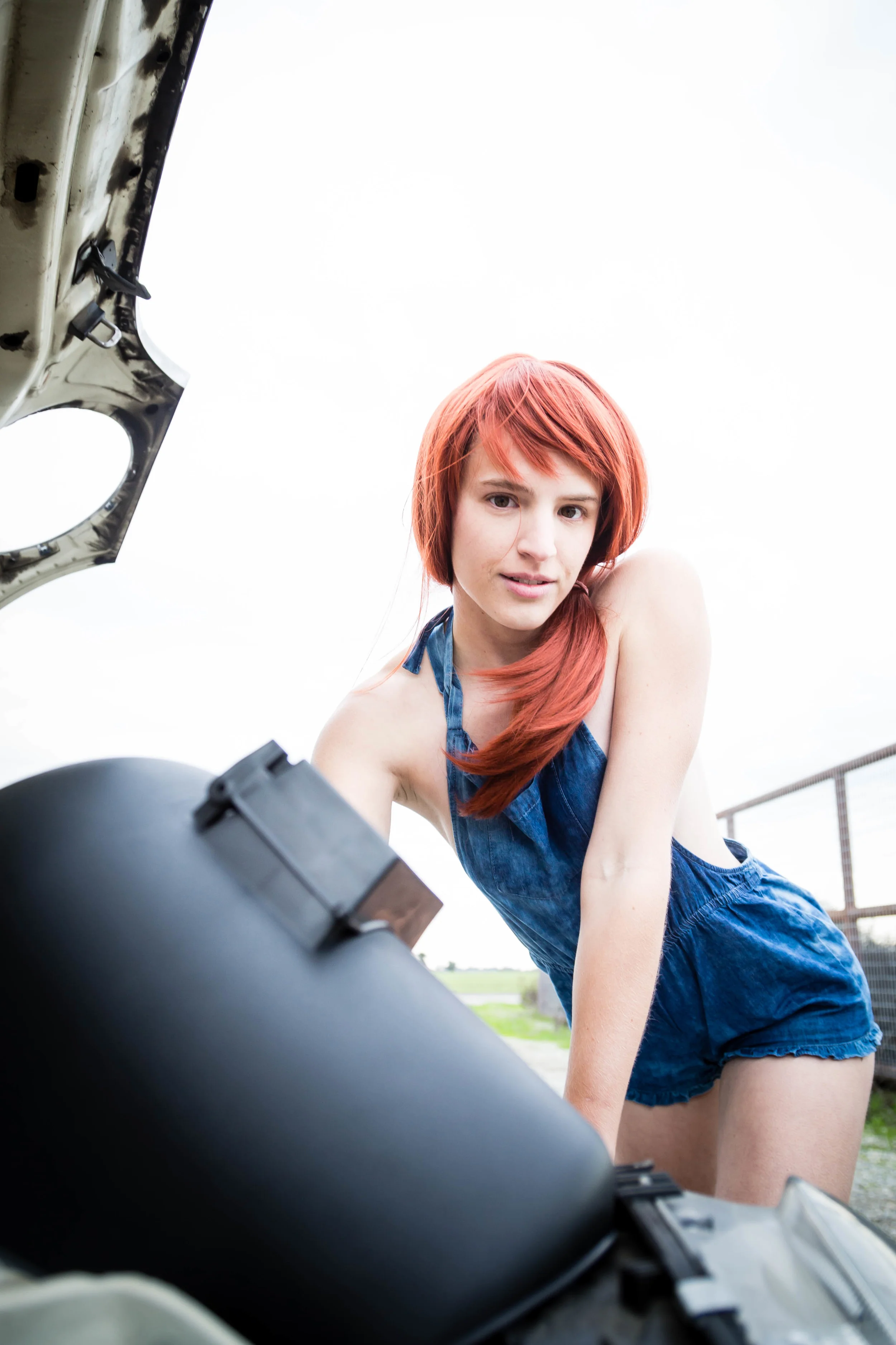 Megan was the model who played Keys. Keys is supposedly a tomboy type of character who likes to work on cars and machines. We didn't have any classic cards around so I lent my own little Mini Cooper for the shoot. It worked out well enough I think. The Cooper has a bit of a vintage-y vibe, and is pretty cute.