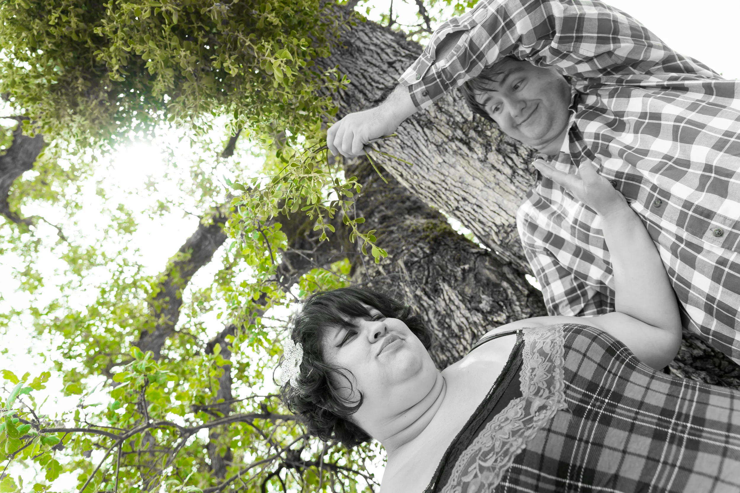 We found a tree full of mistletoe. I chose to highlight the green here make it really stand out. We did fun and silly photos like this where Danae is brushing off George as well as some real kissing action under the mistletoe!